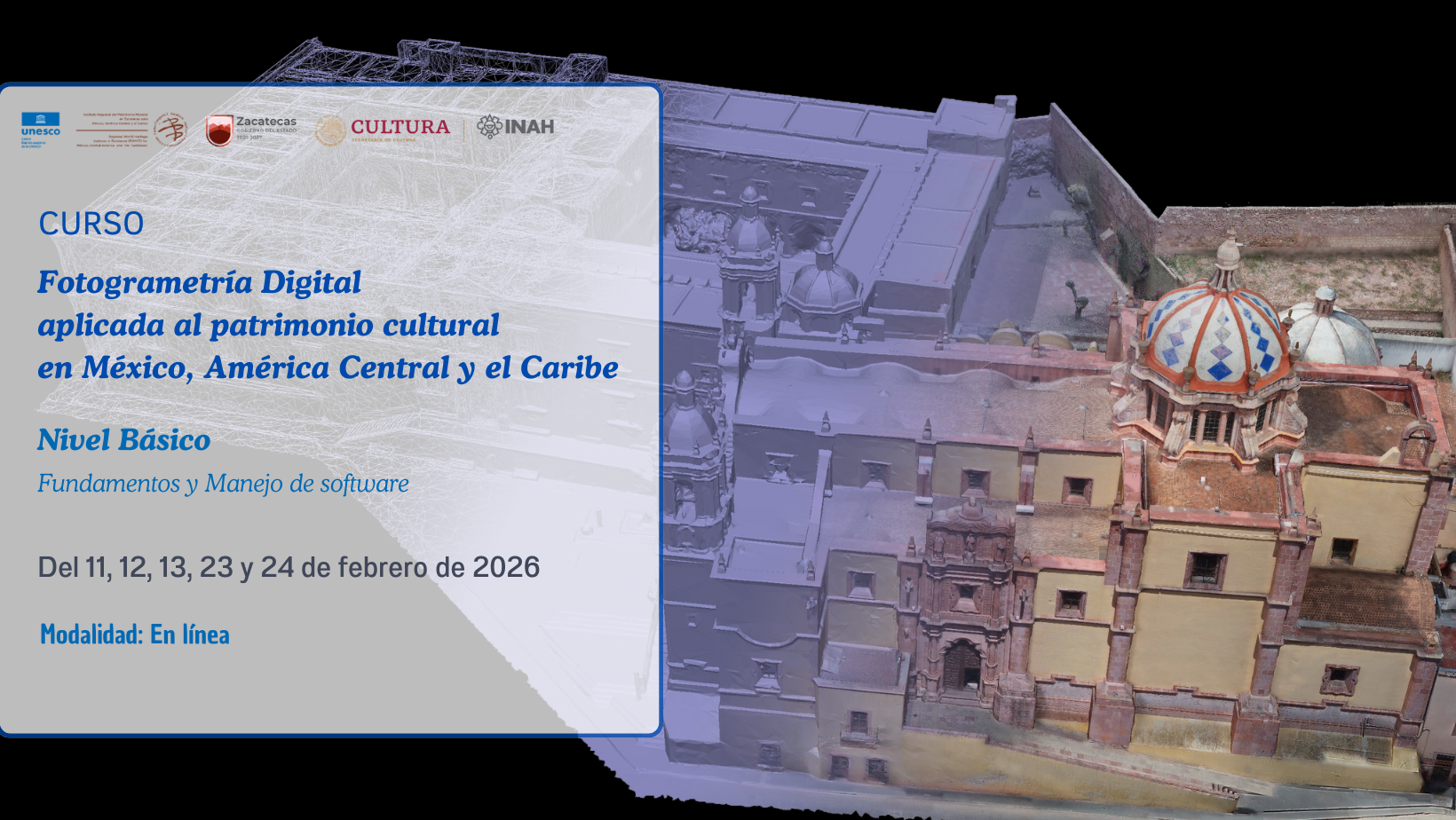 El curso busca ofrecer a los participantes el conocimiento y manejo de la fotogrametría, enfocada en la digitalización tridimensional de bienes inmuebles o patrimonio edificado. Esta tecnología permite una documentación precisa del bien, generando una copia virtual apta de ser manipulada para diversos fines. Al final del curso los participantes tendrán las competencias y conocimientos para aplicar esta técnica a sus bienes patrimoniales.